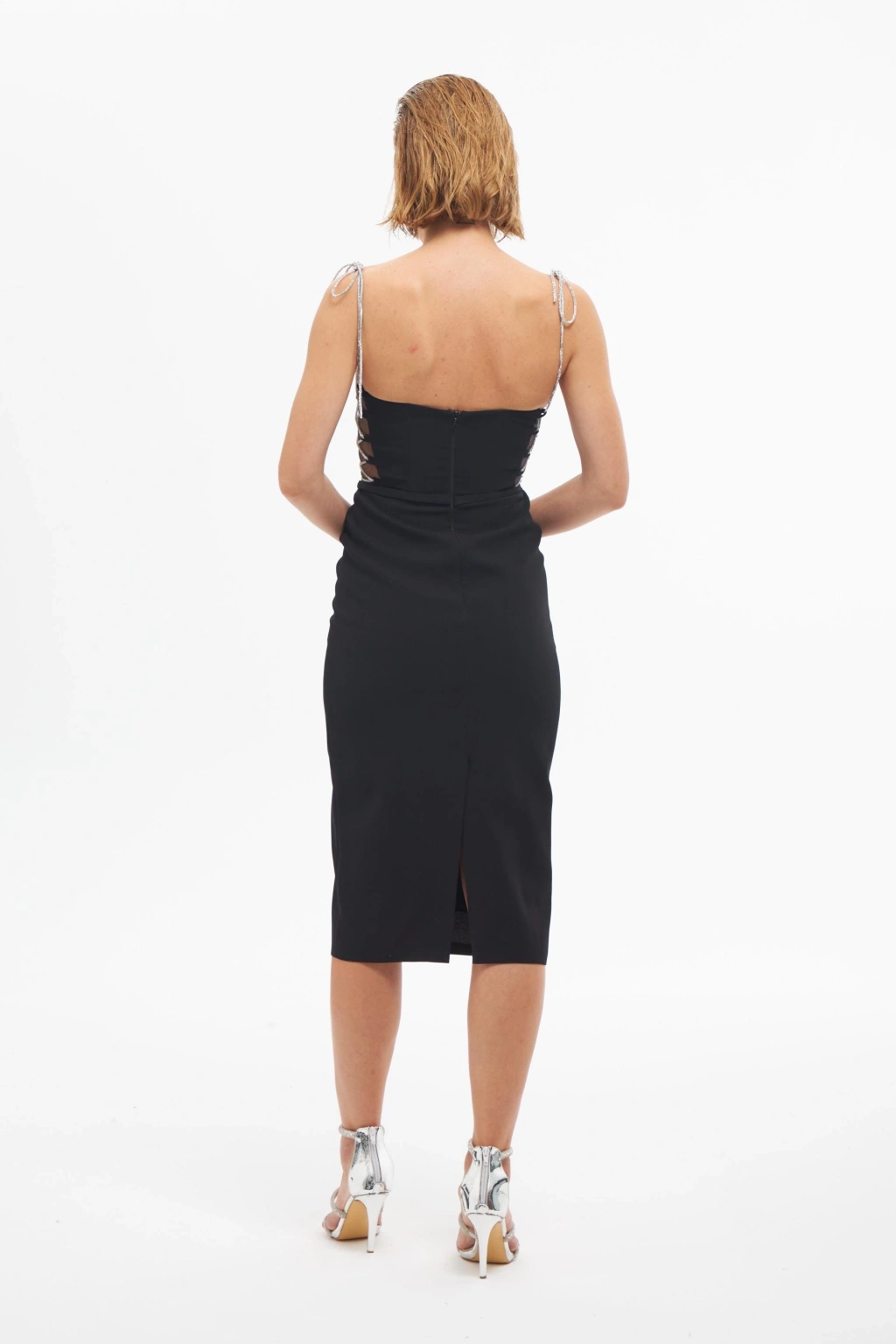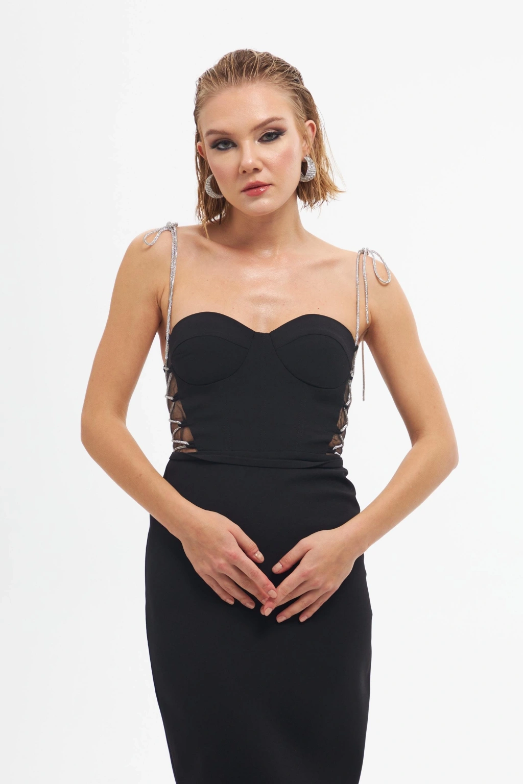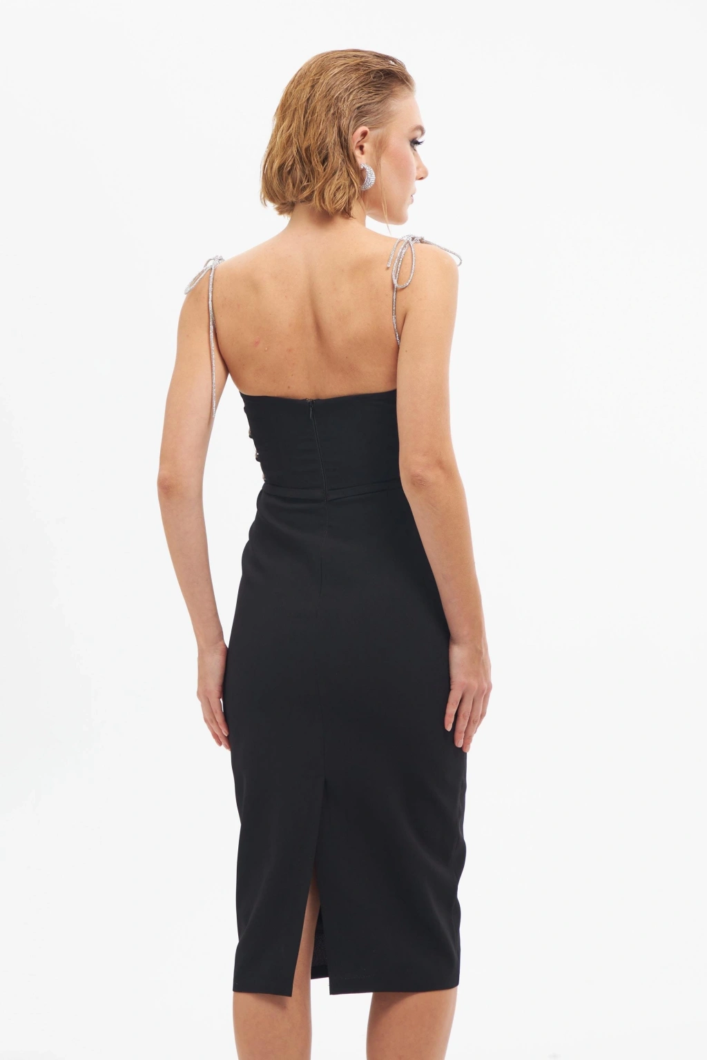 ASKILARI SİMLİ IŞILTILI KALP YAKA SİYAH ELBİSE