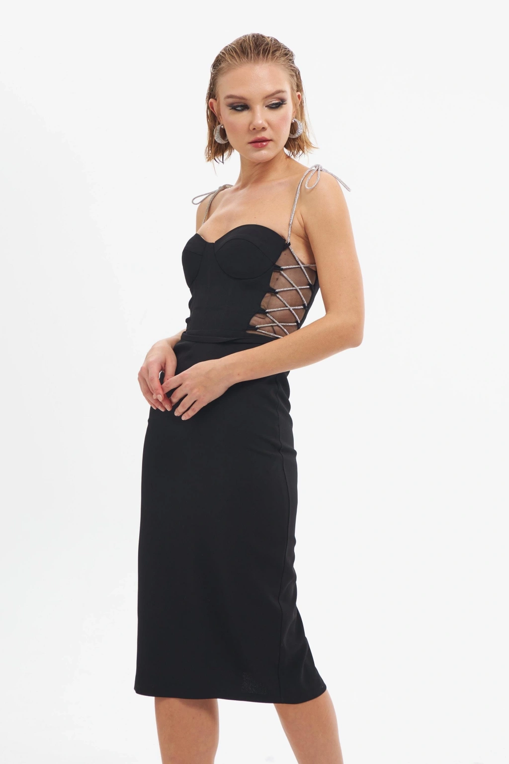 TRANSPARAN BEL DETAYLI SİYAH ELBİSE