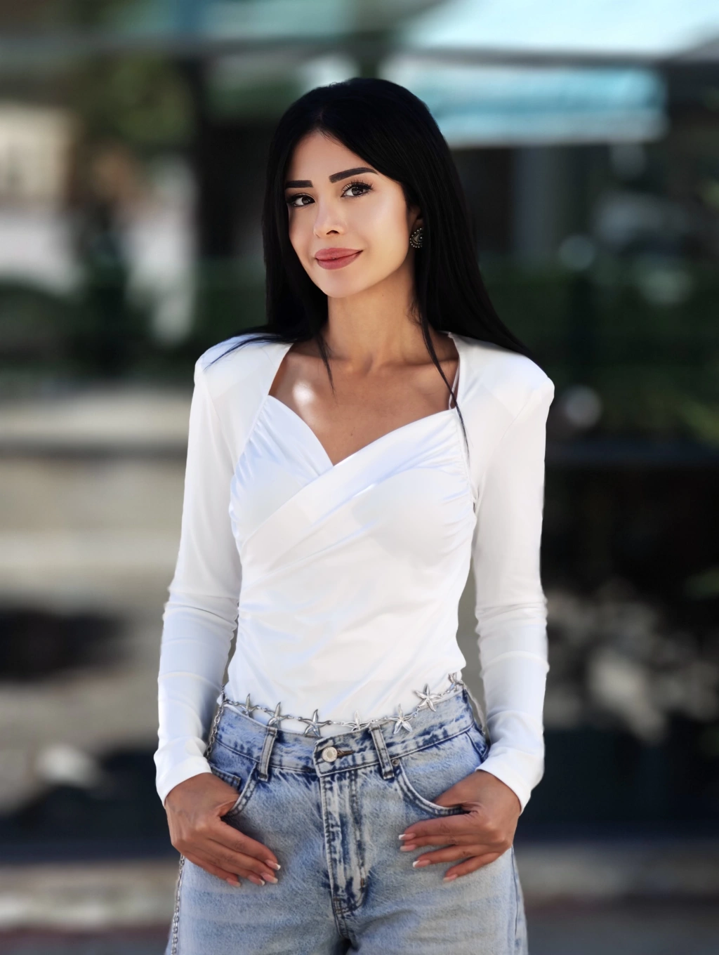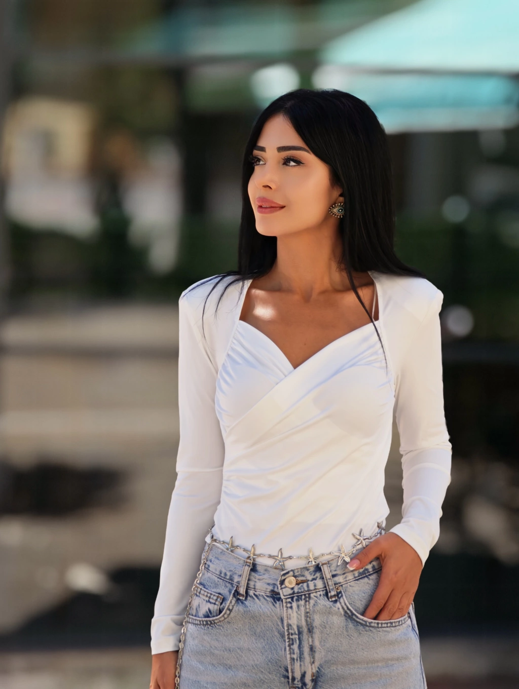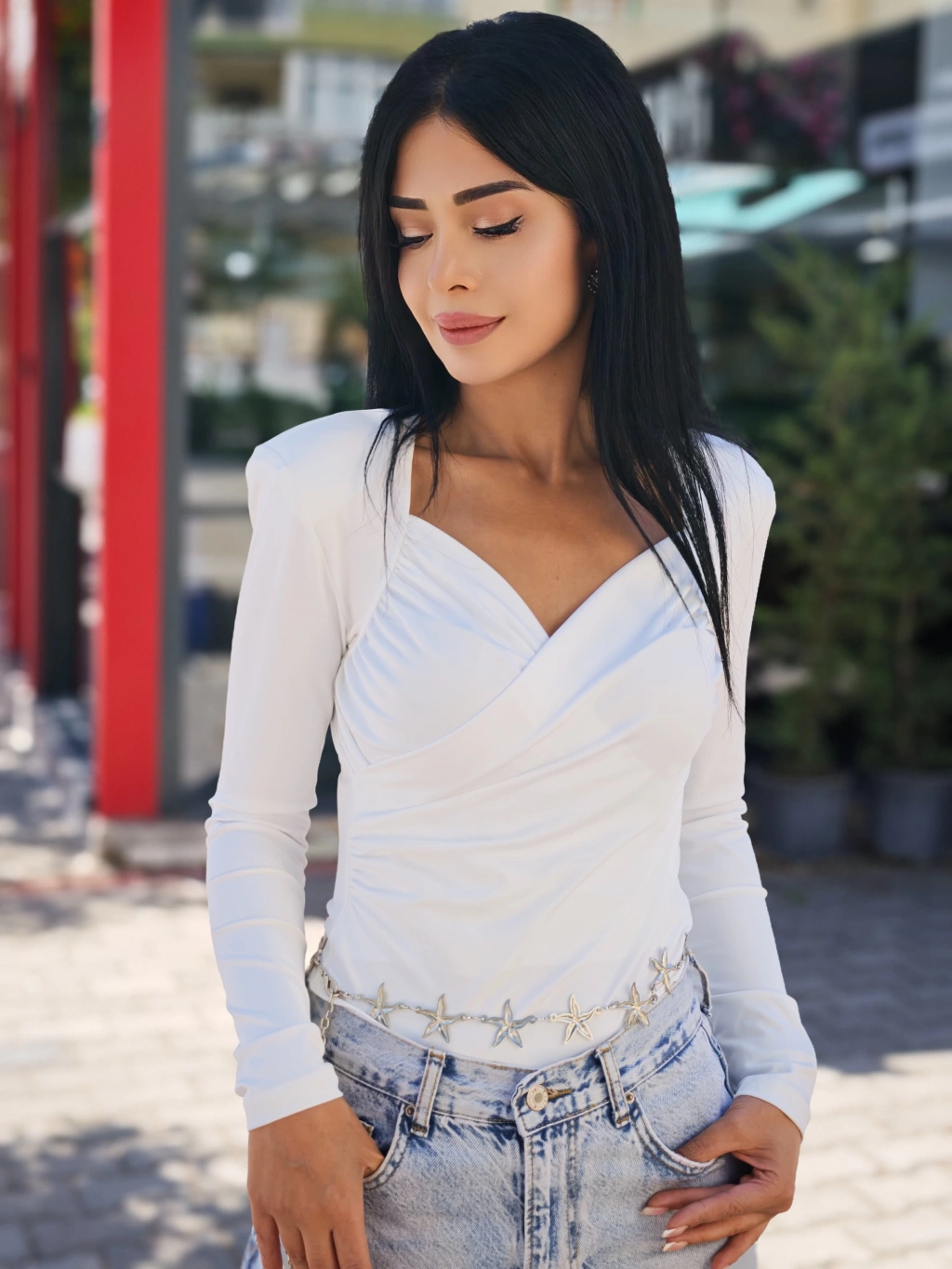 ✨ Kruvaze yaka, drape detaylı beyaz likralı bluz ✨