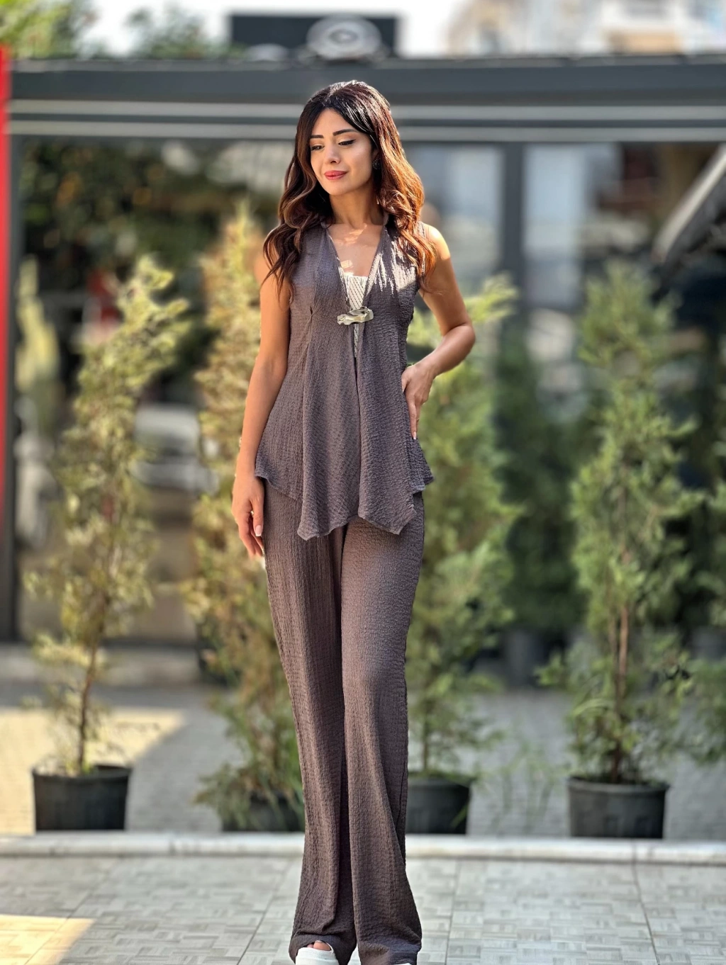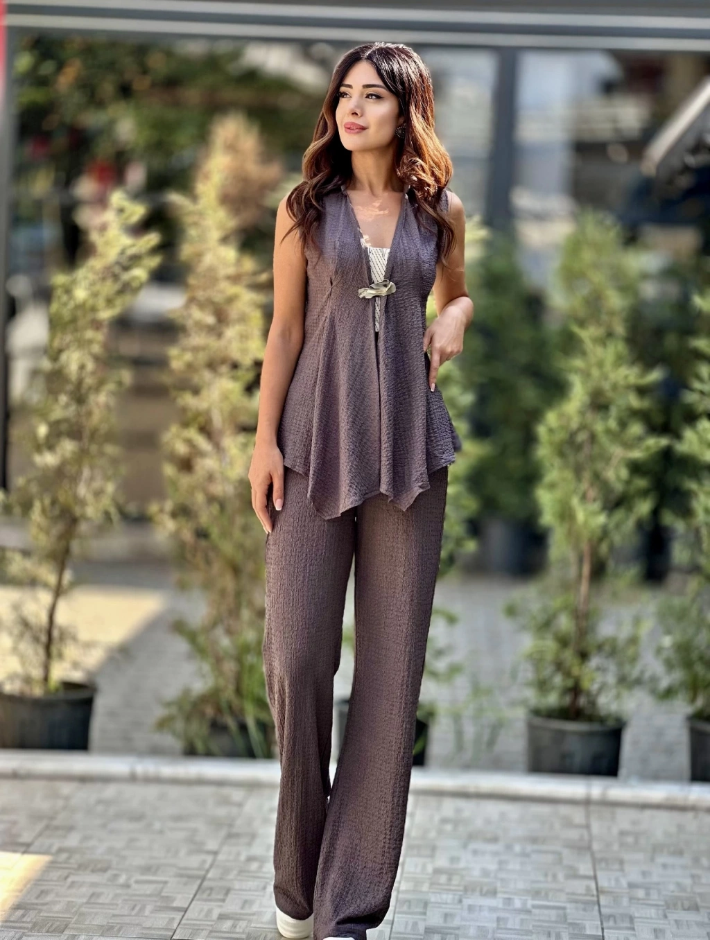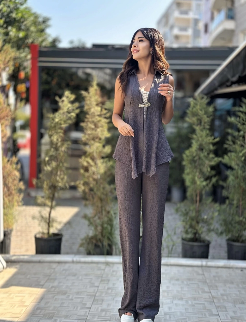 BROŞ DETAYLI UZUN YELEK PANTOLON TAKIM