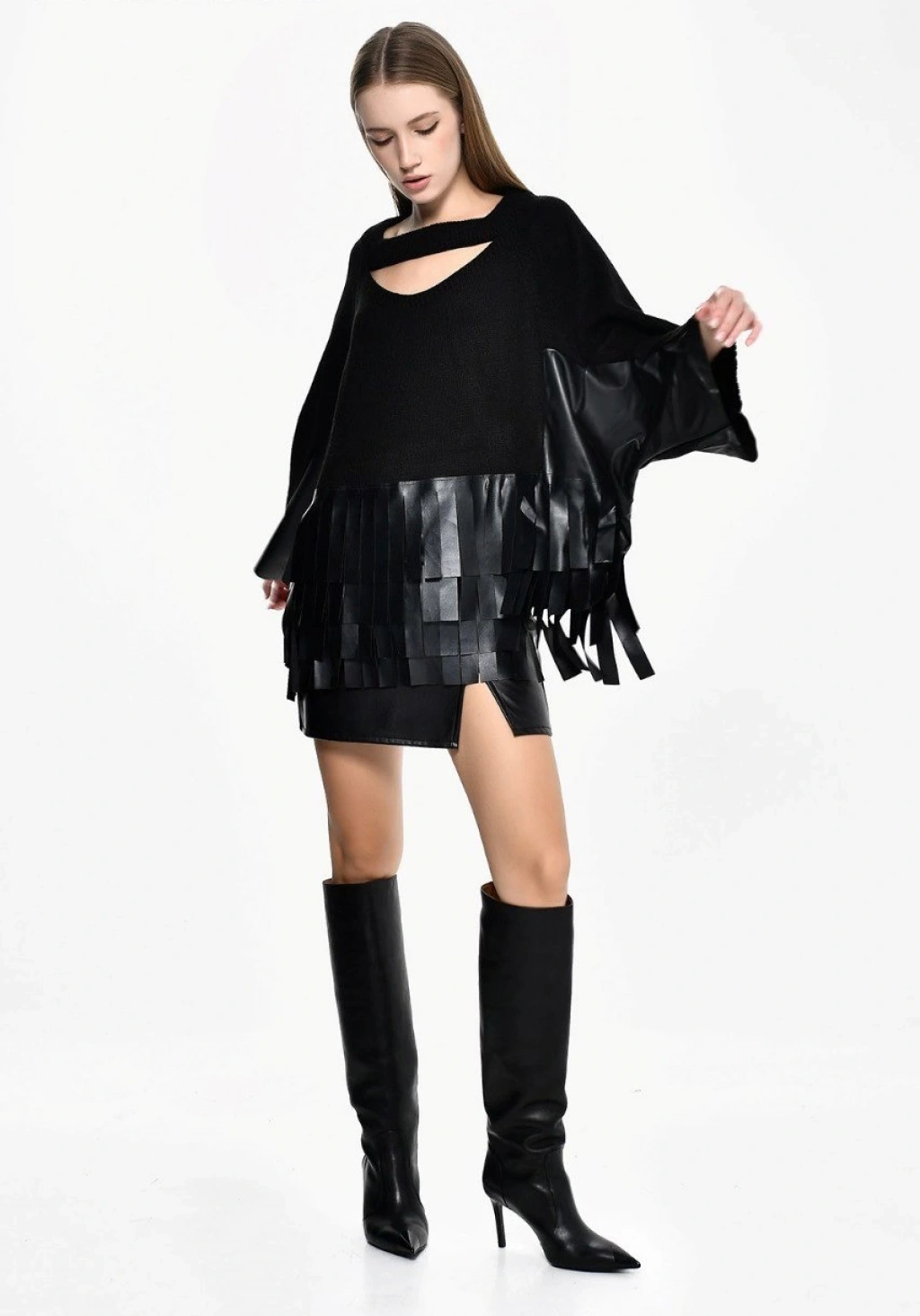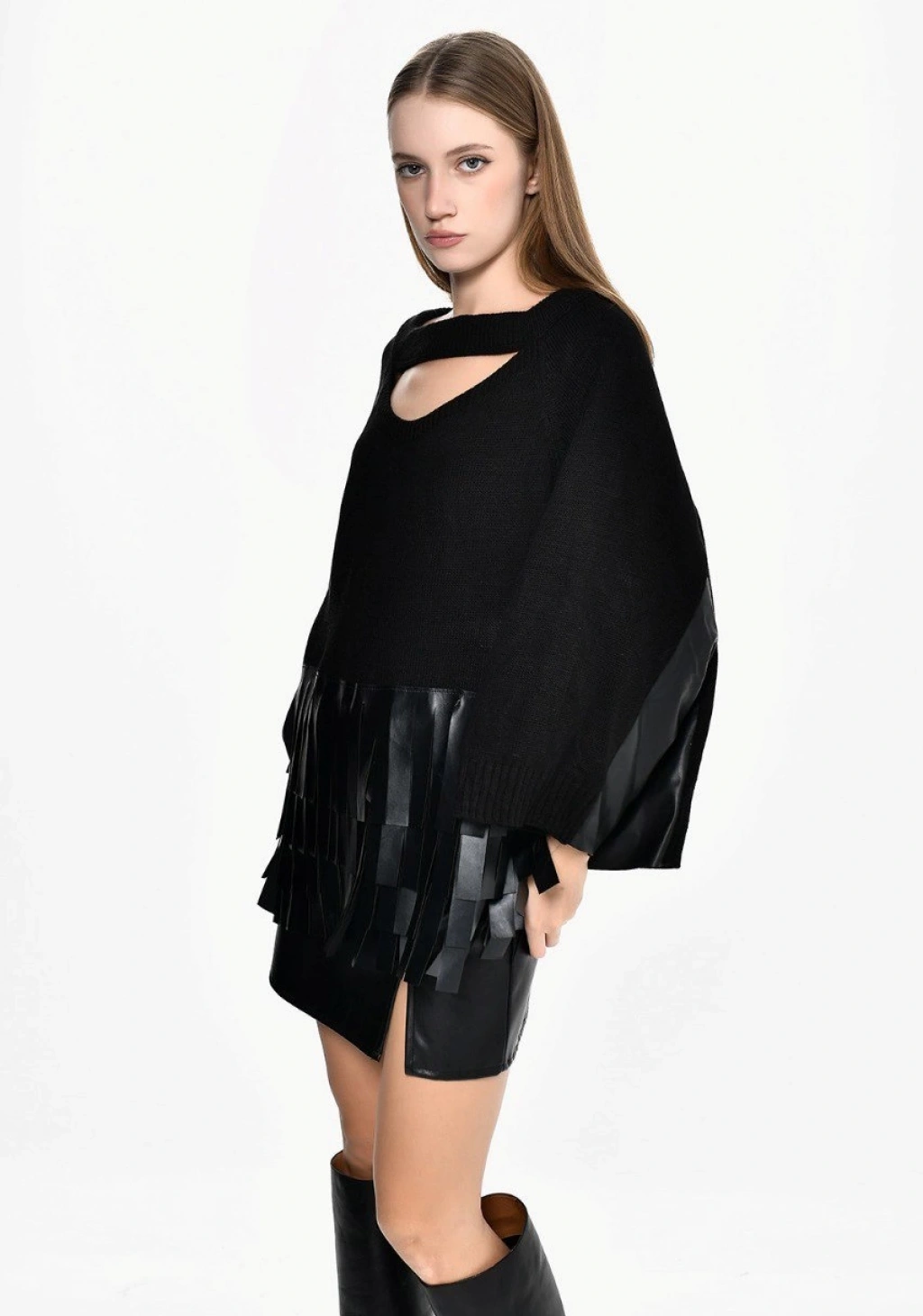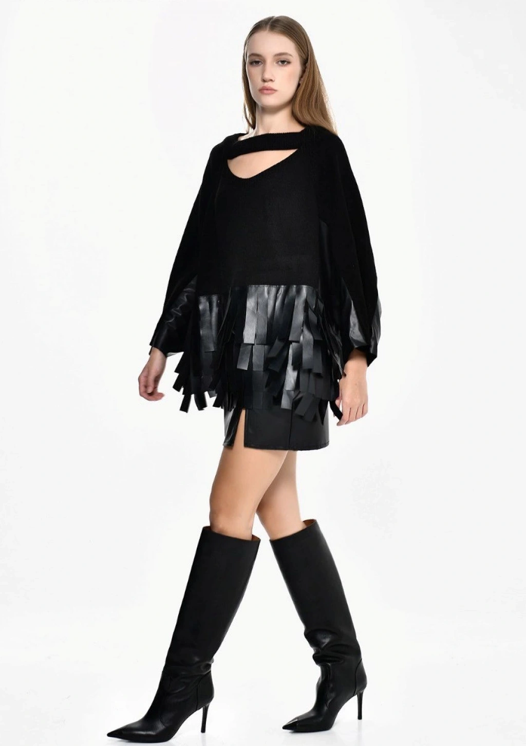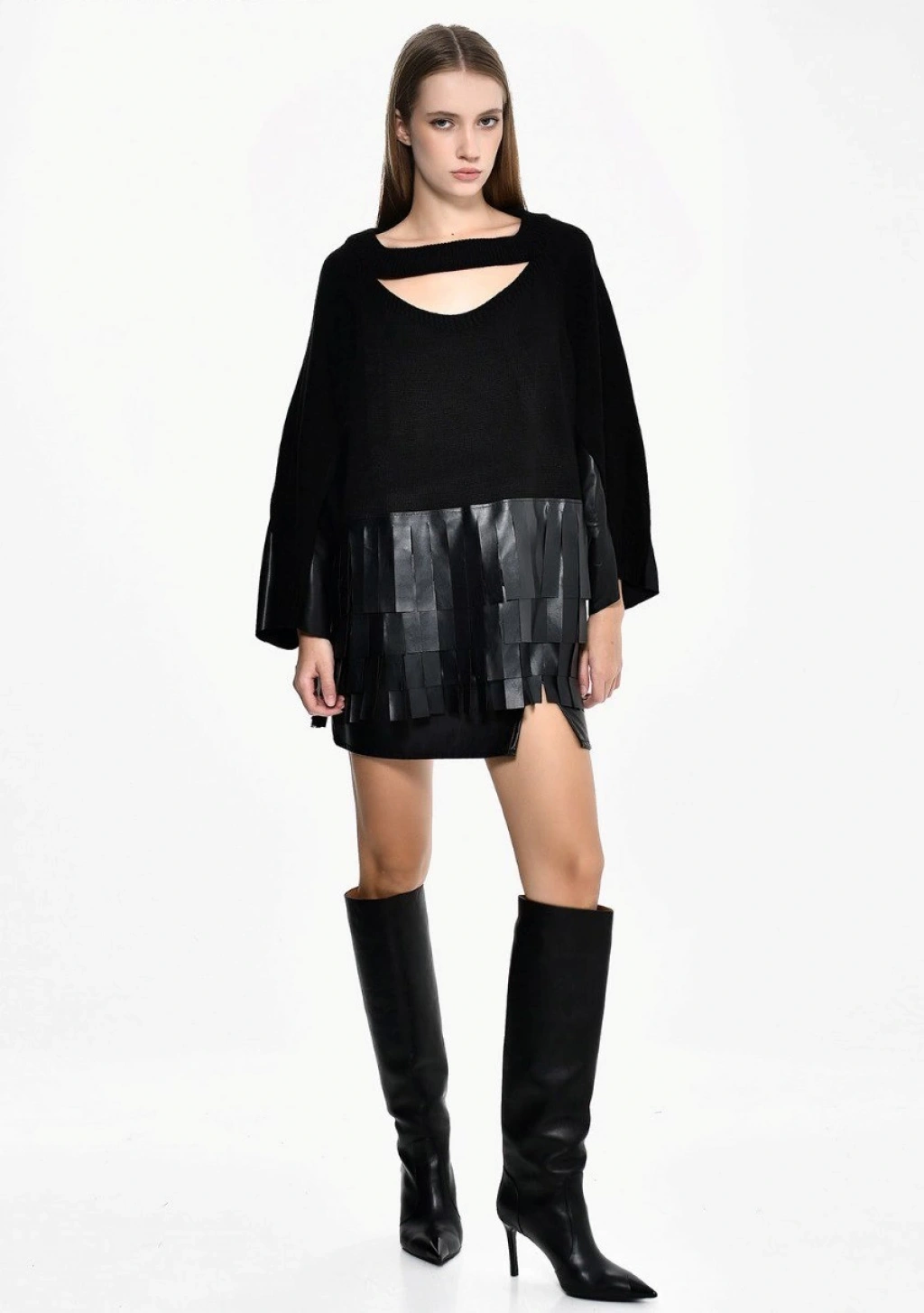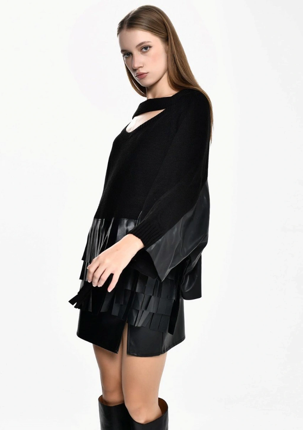 TAŞLI DERİ PENCERE DETAY SİYAH BOĞAZLI KAZAK