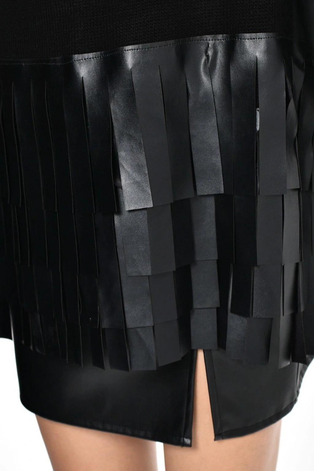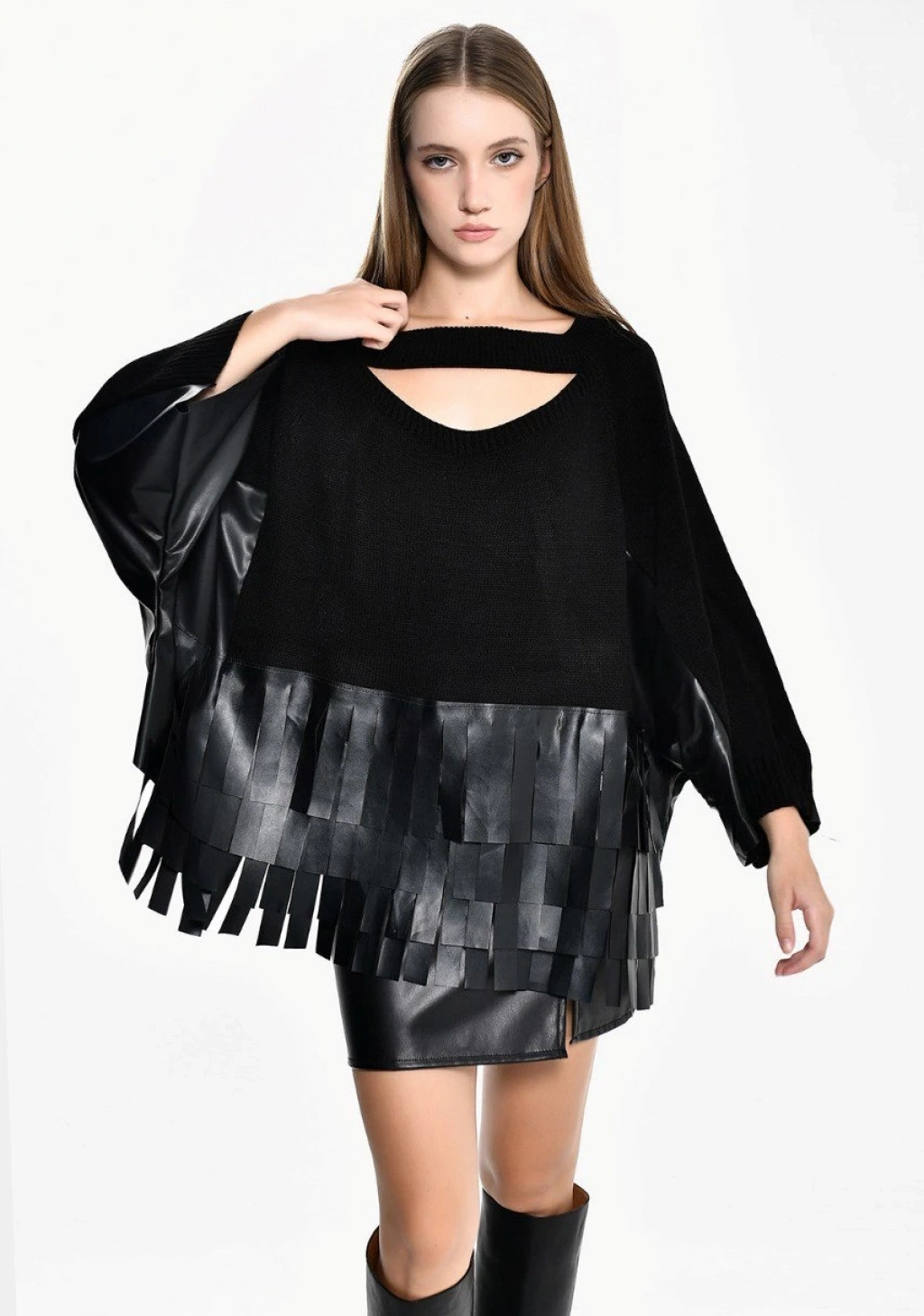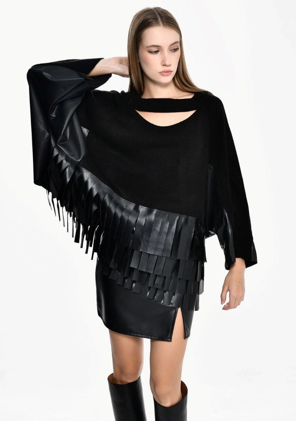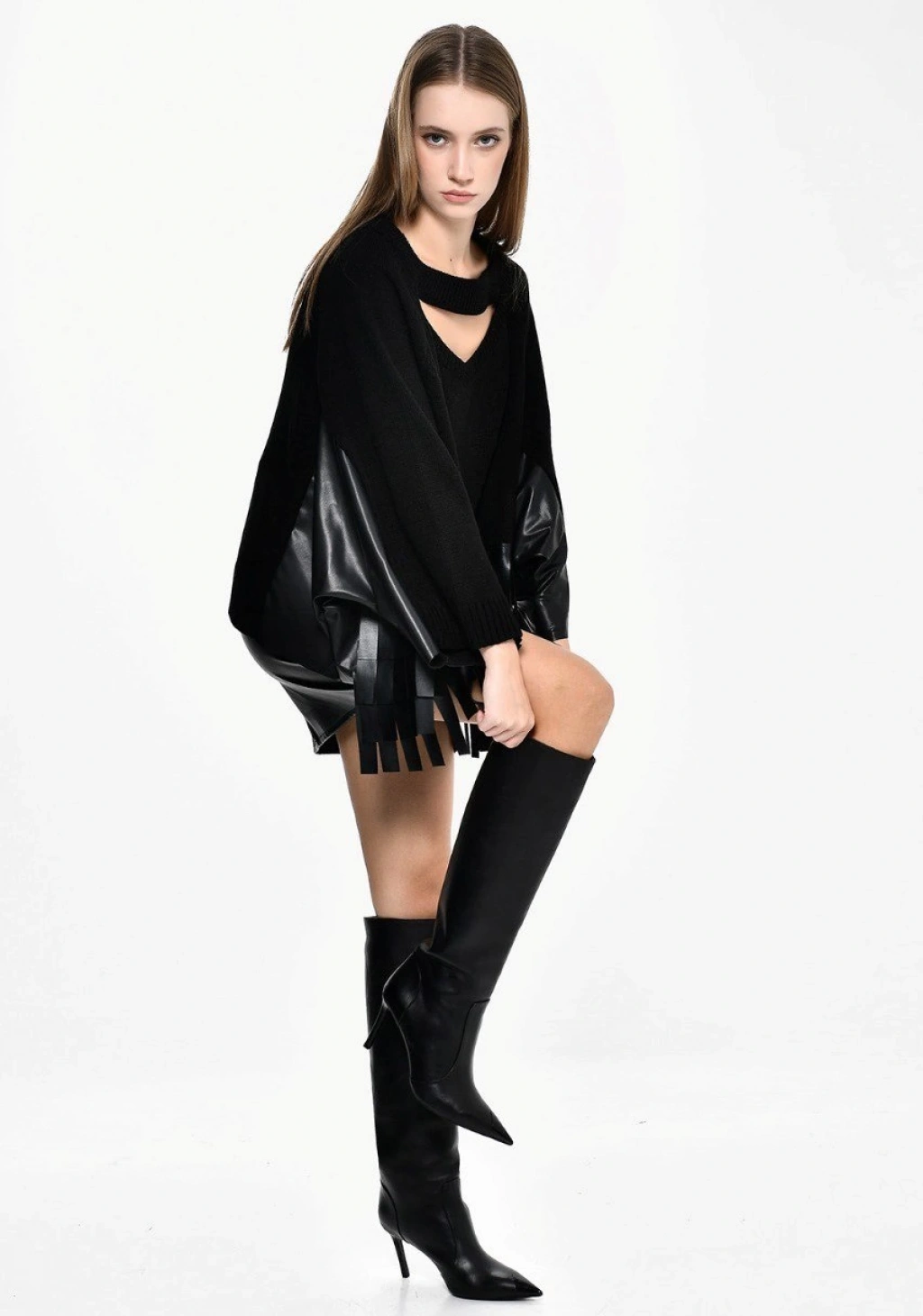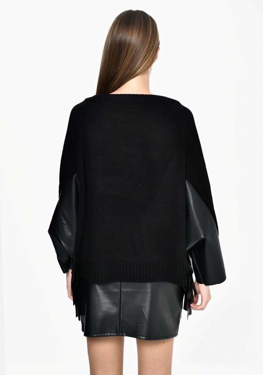 TAŞLI DERİ PENCERE DETAY SİYAH BOĞAZLI KAZAK
