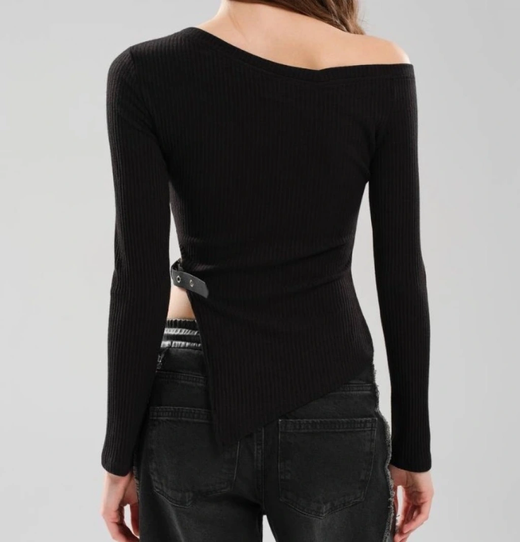 DERİ TOKA DETAY ASİMETRİK SİYAH BLUZ