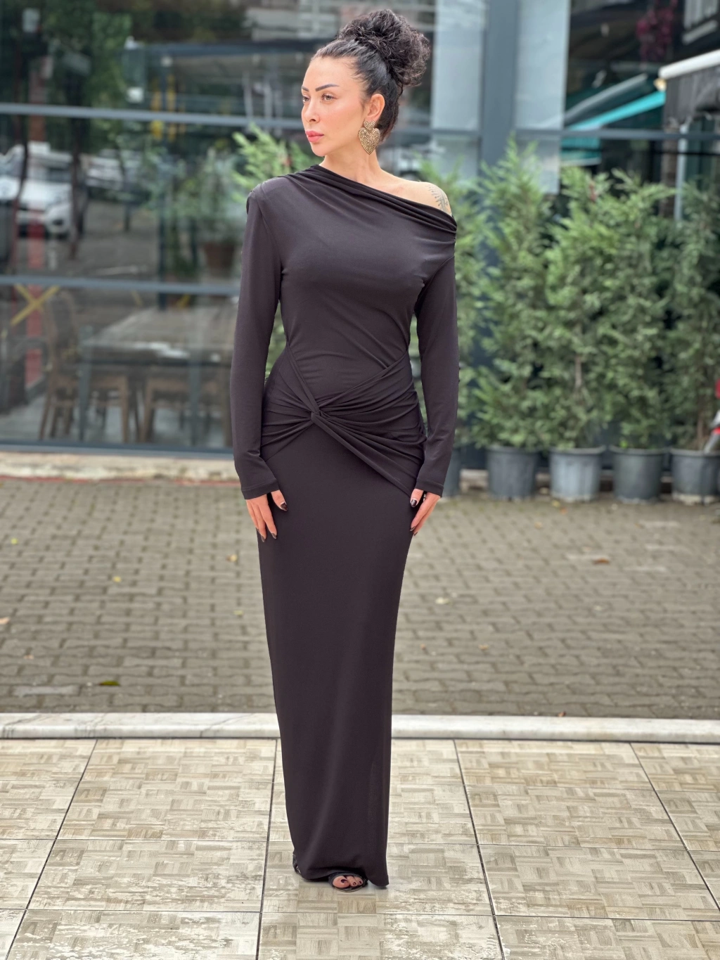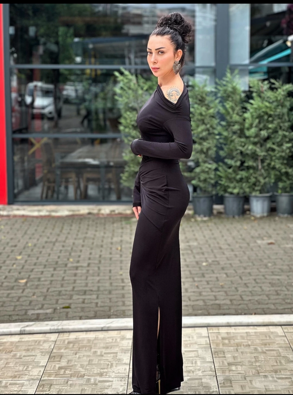 DÜŞÜK OMUZ YAN DÜĞÜMLÜ SİYAH ELBİSE