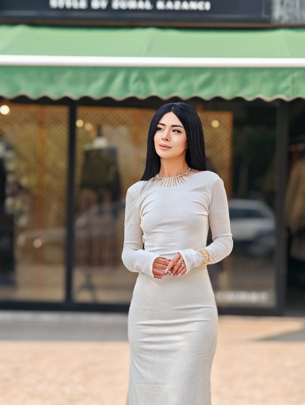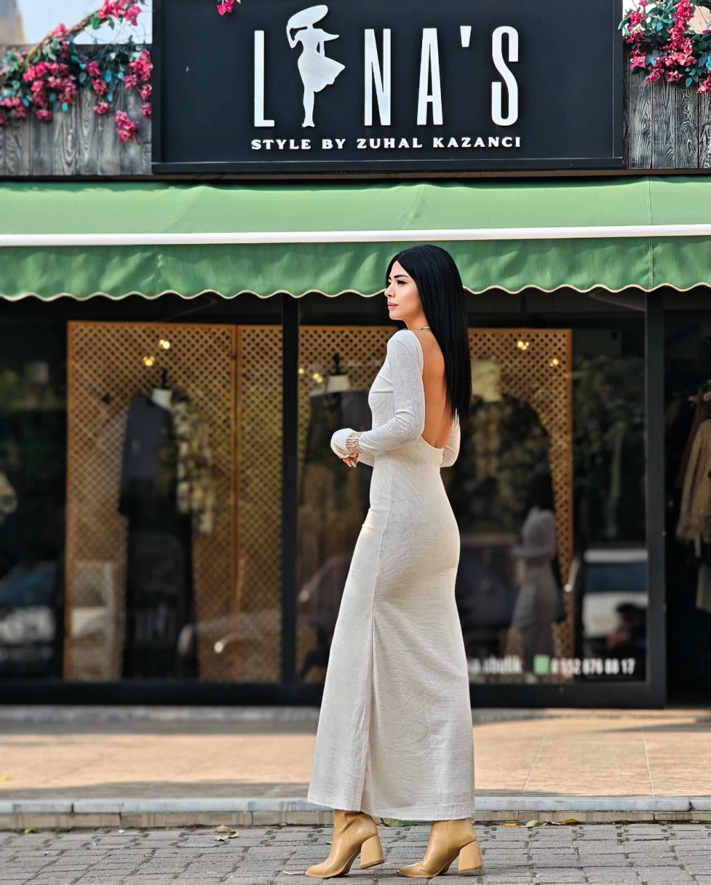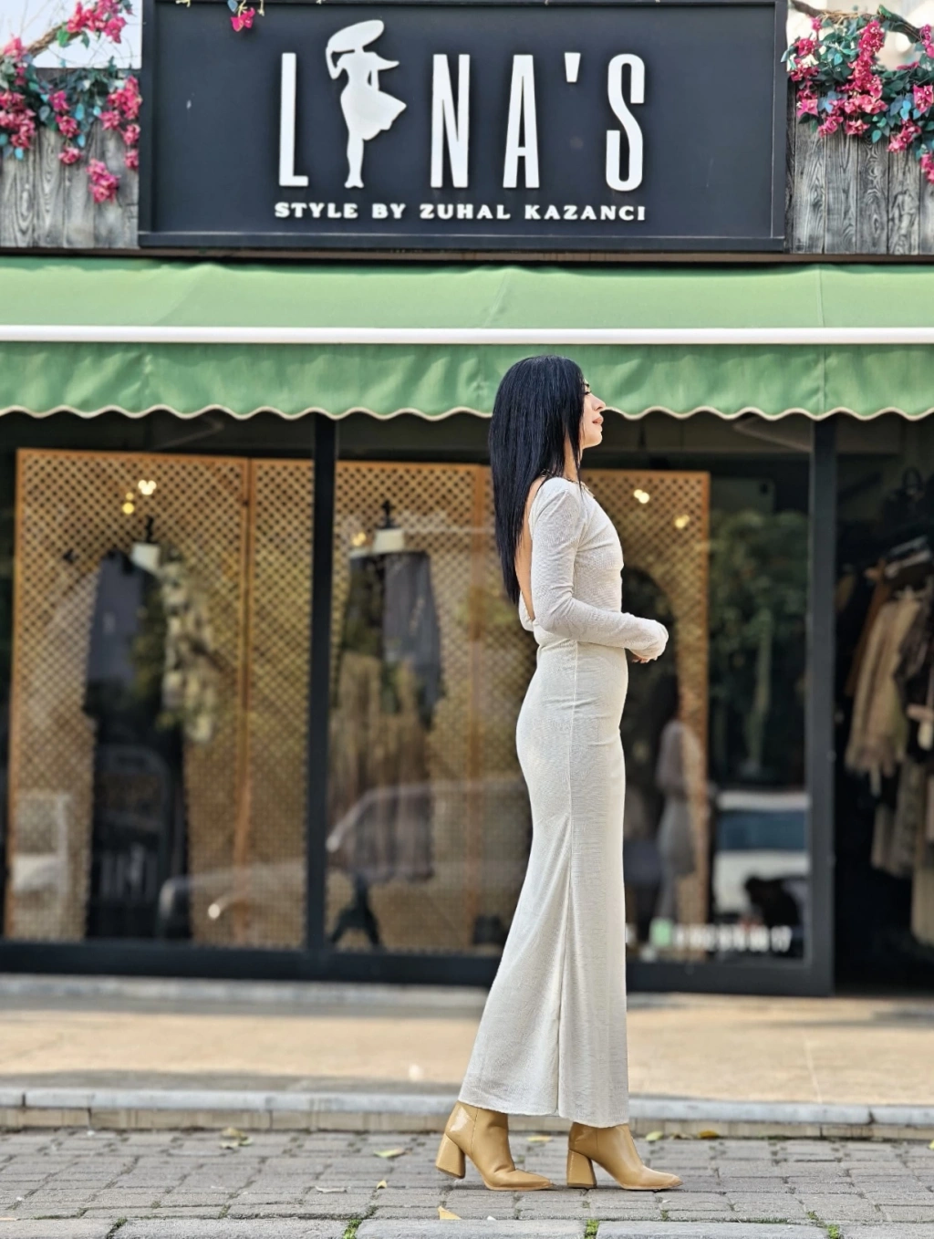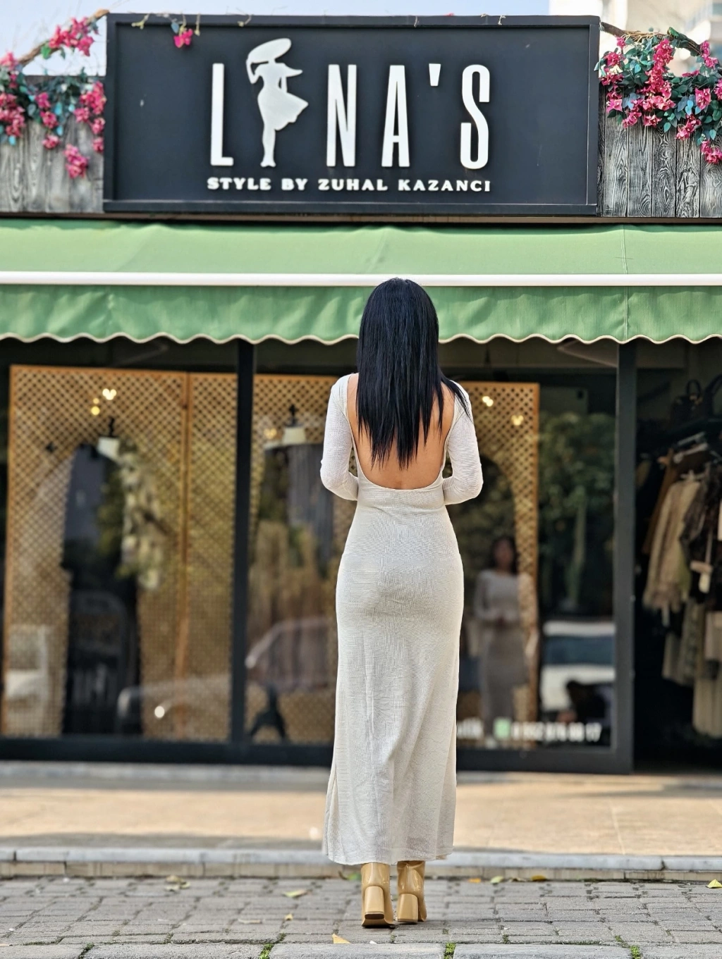 EKRU SIRT DEKOLTELİ ELBİSE
