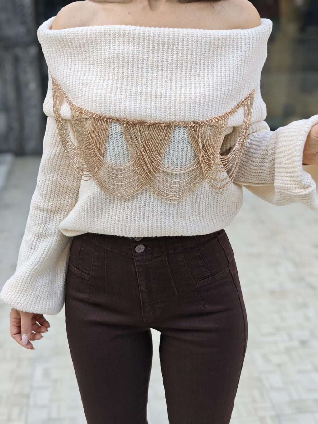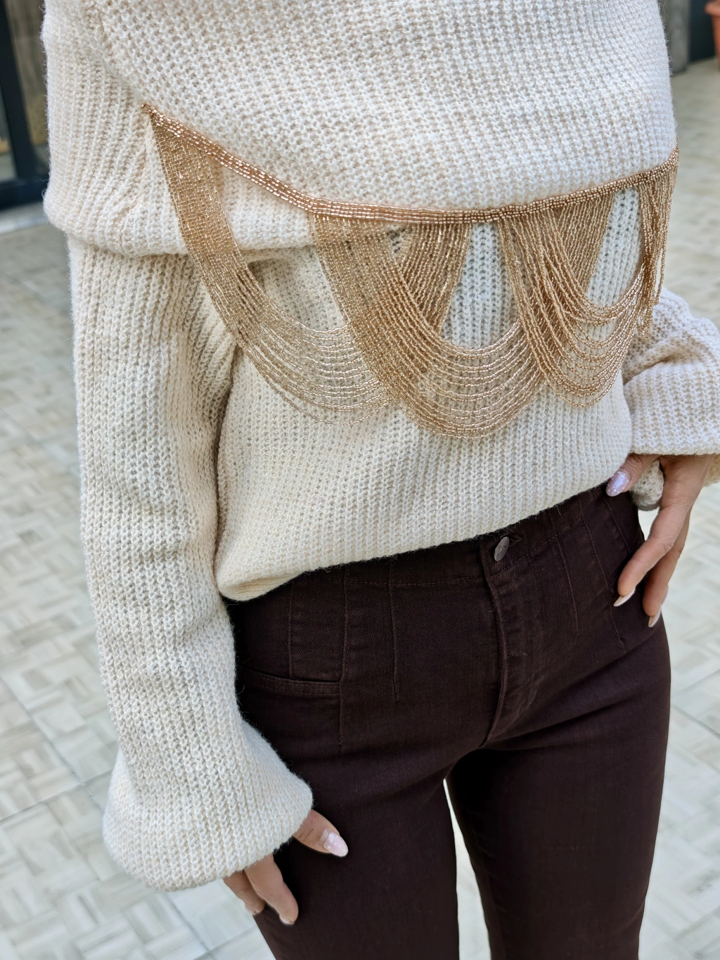 GOLD BONCUK DETAYLI EKRU TRİKO
