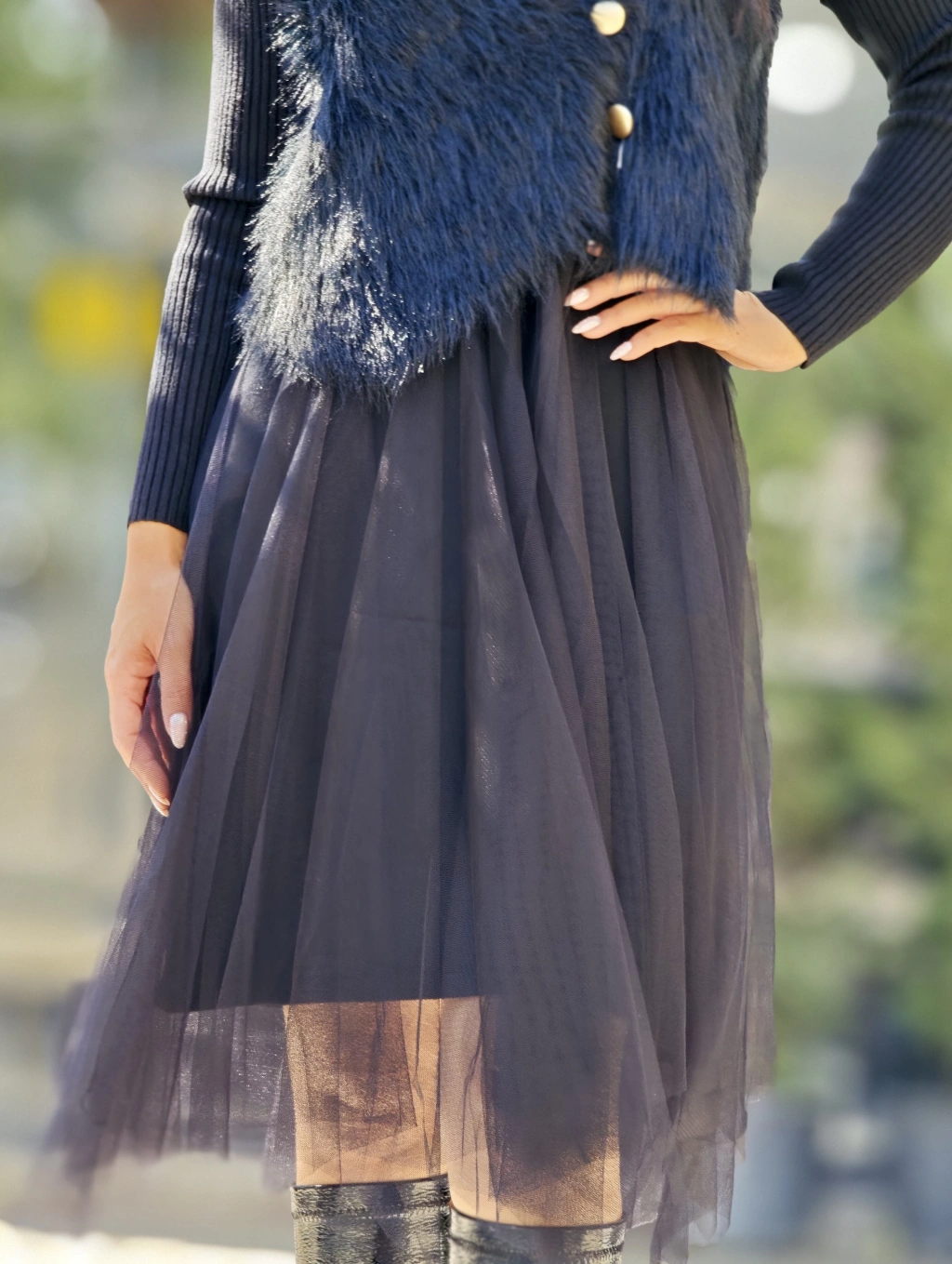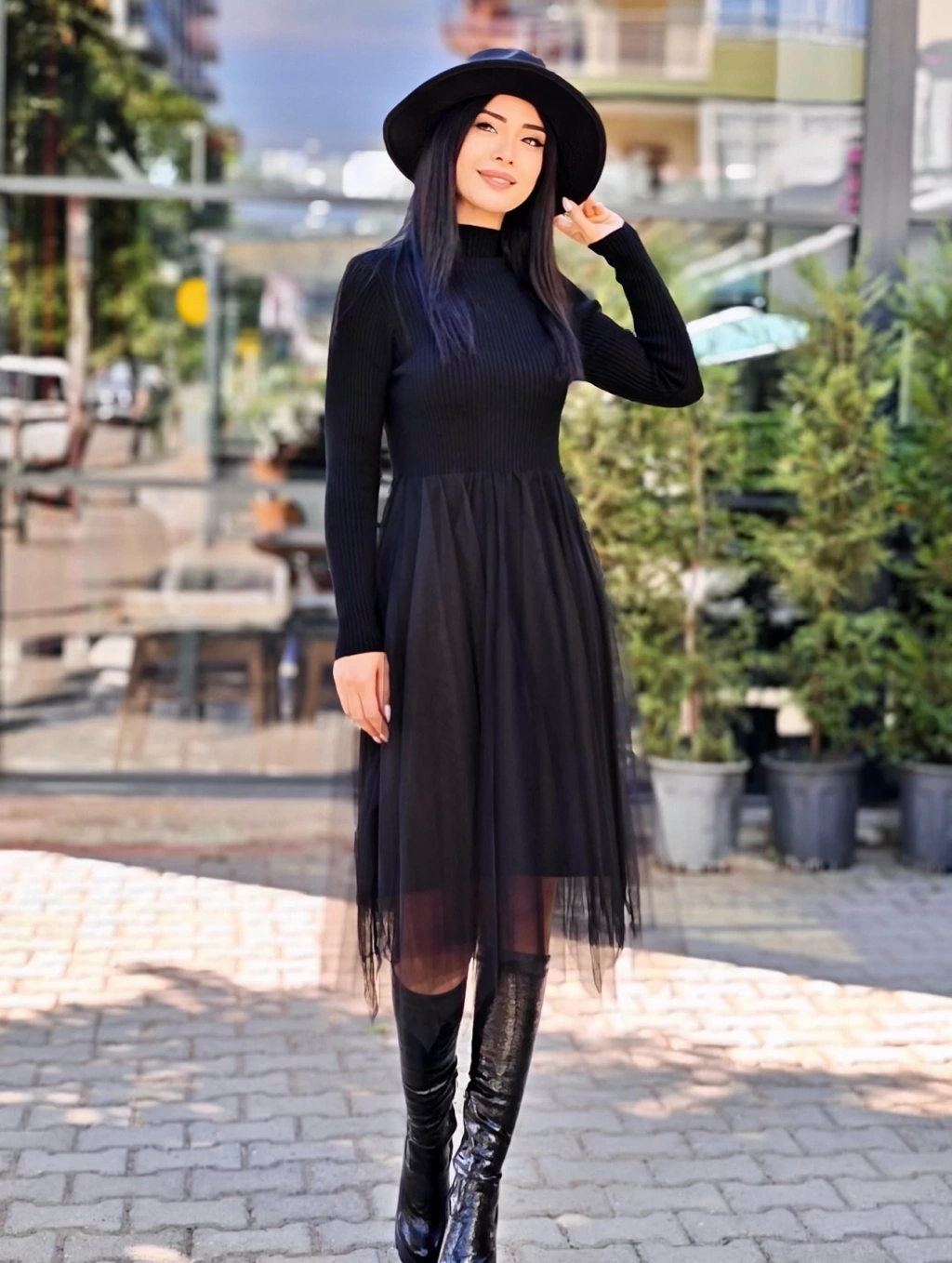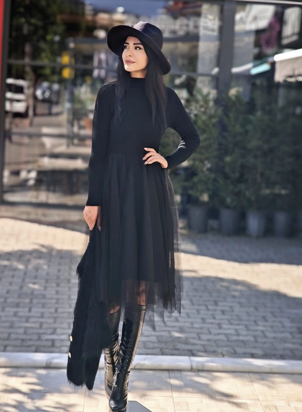 İTHAL TRİKO TÜL DETAY SİYAH ELBİSE