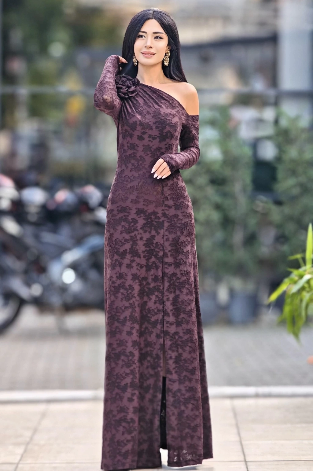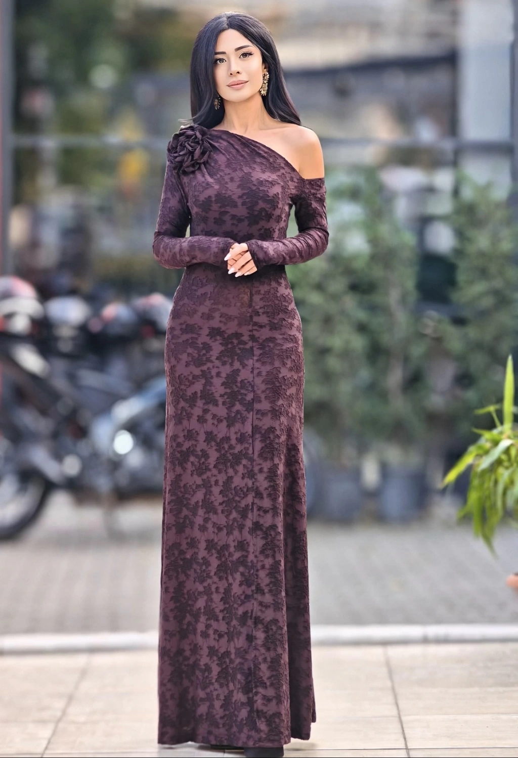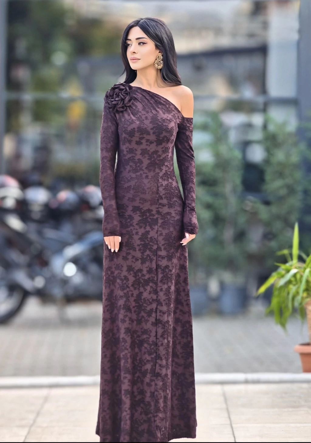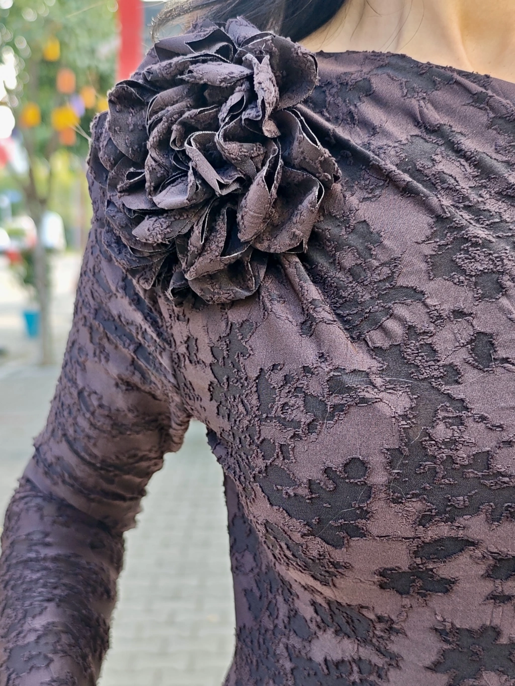 KAHVE GÜL BROŞ DETAYLI TÜL ELBİSE
