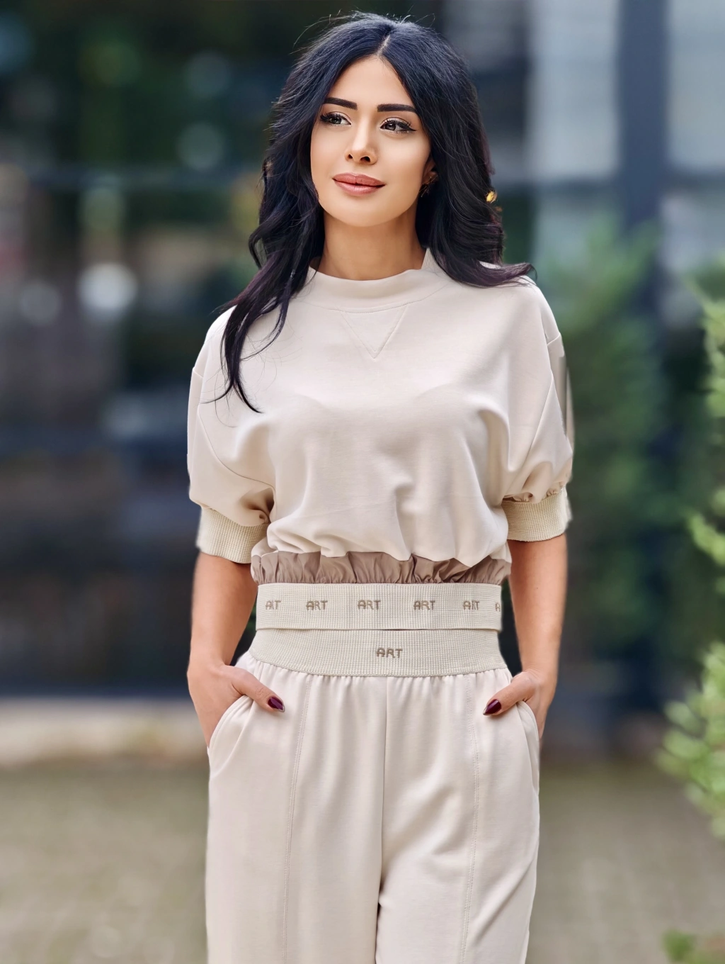 EKRU İŞLEMELİ ŞORTLU TAKIM