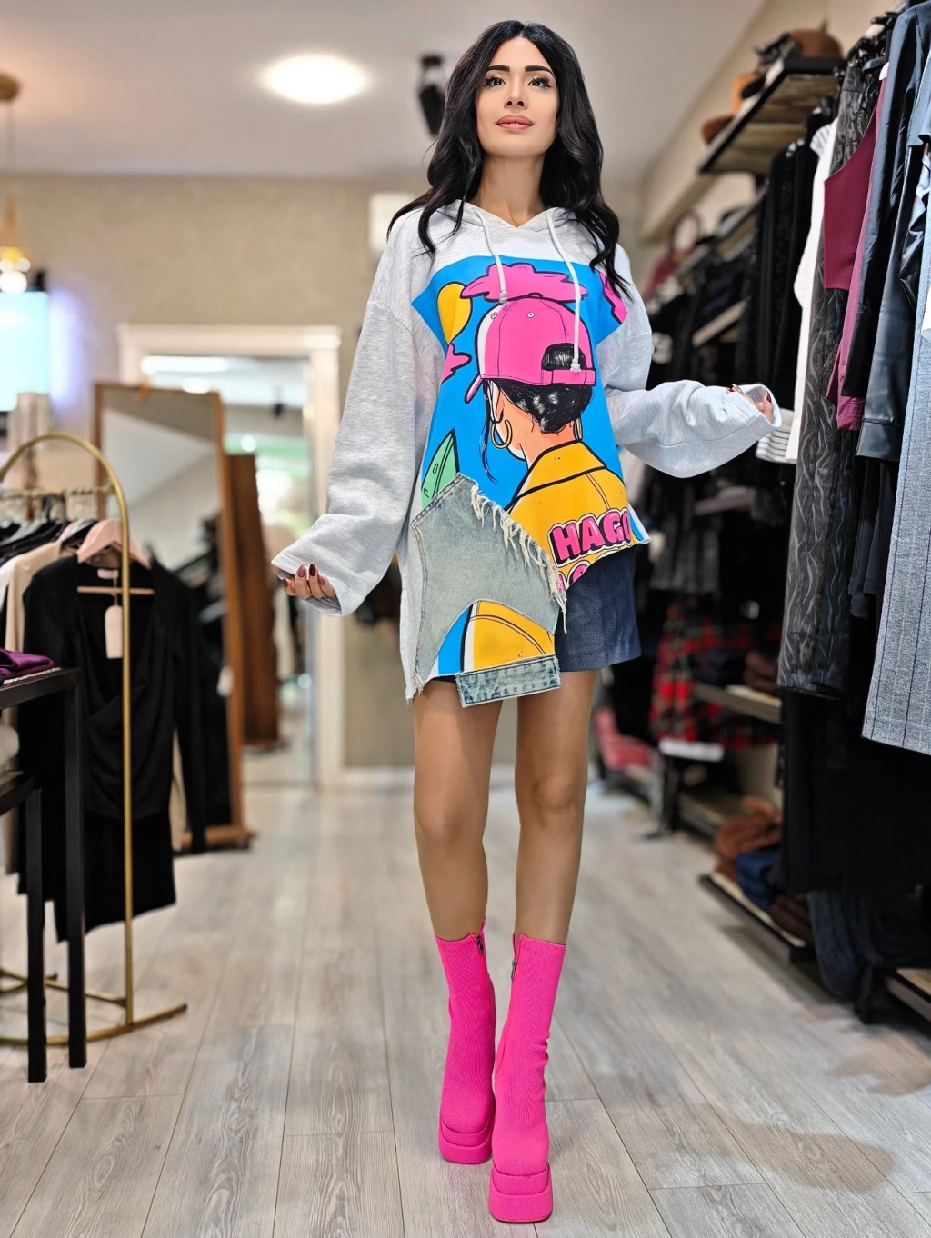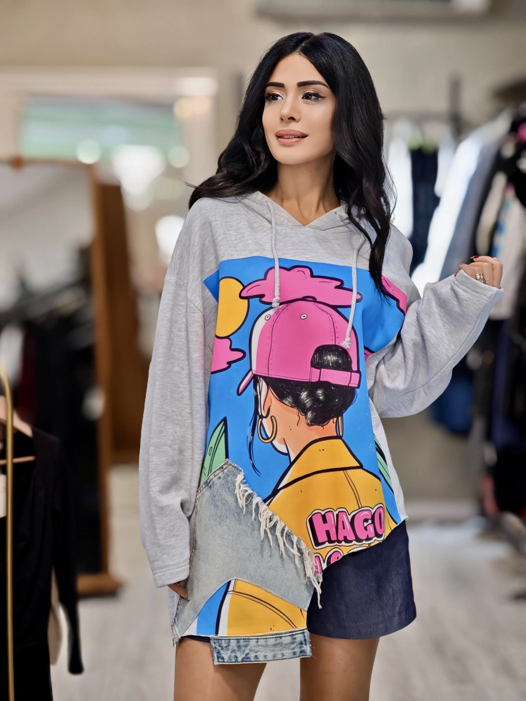 RENKLİ ŞAPKALI BASKILI GRİ SWEAT