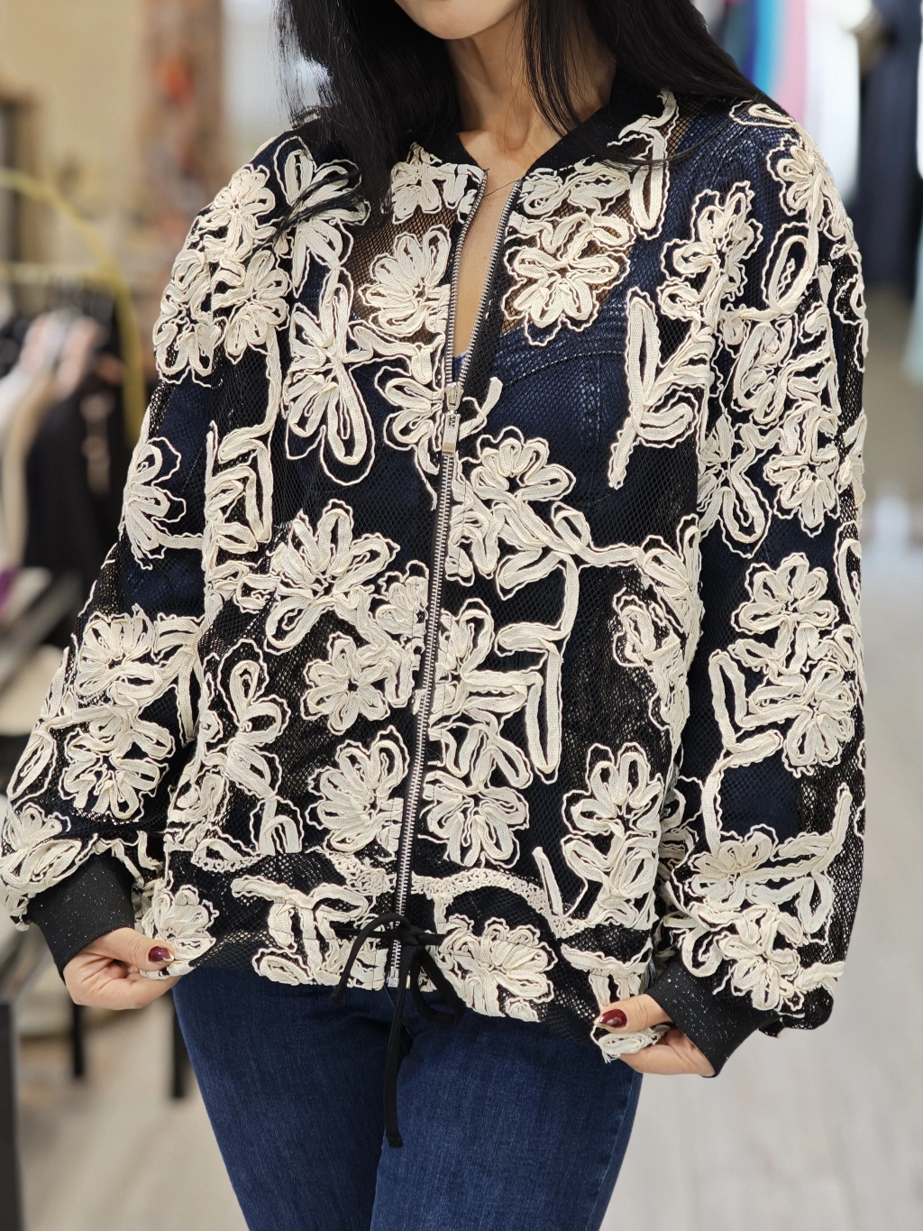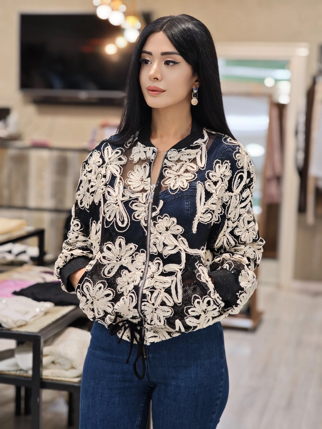 SİYAH KREM ÇİÇEKLİ FERMUARLI HIRKA