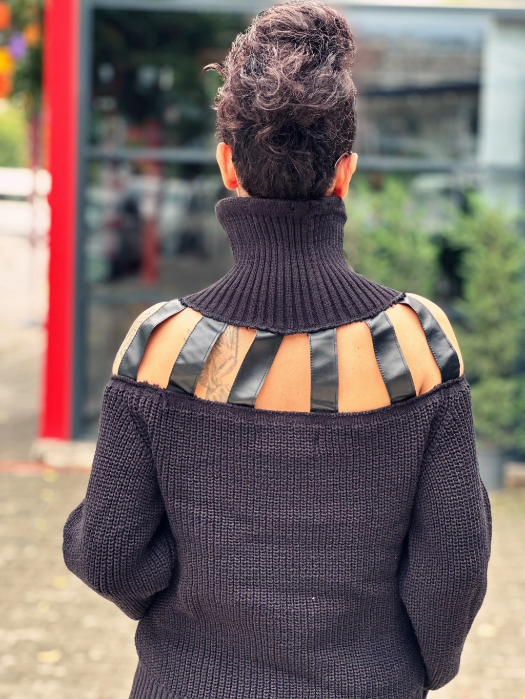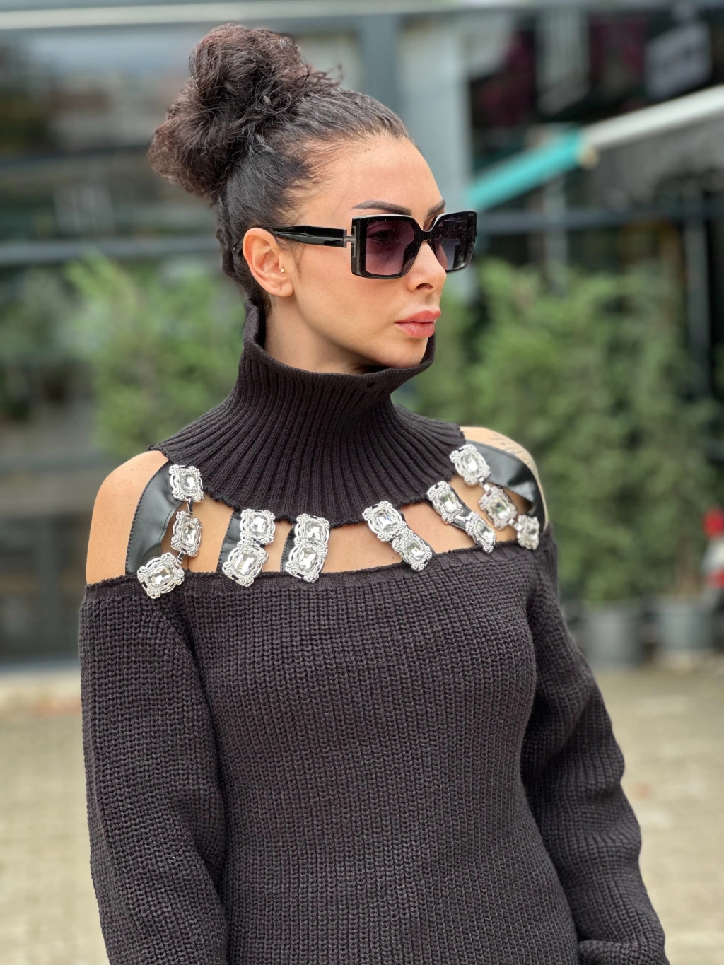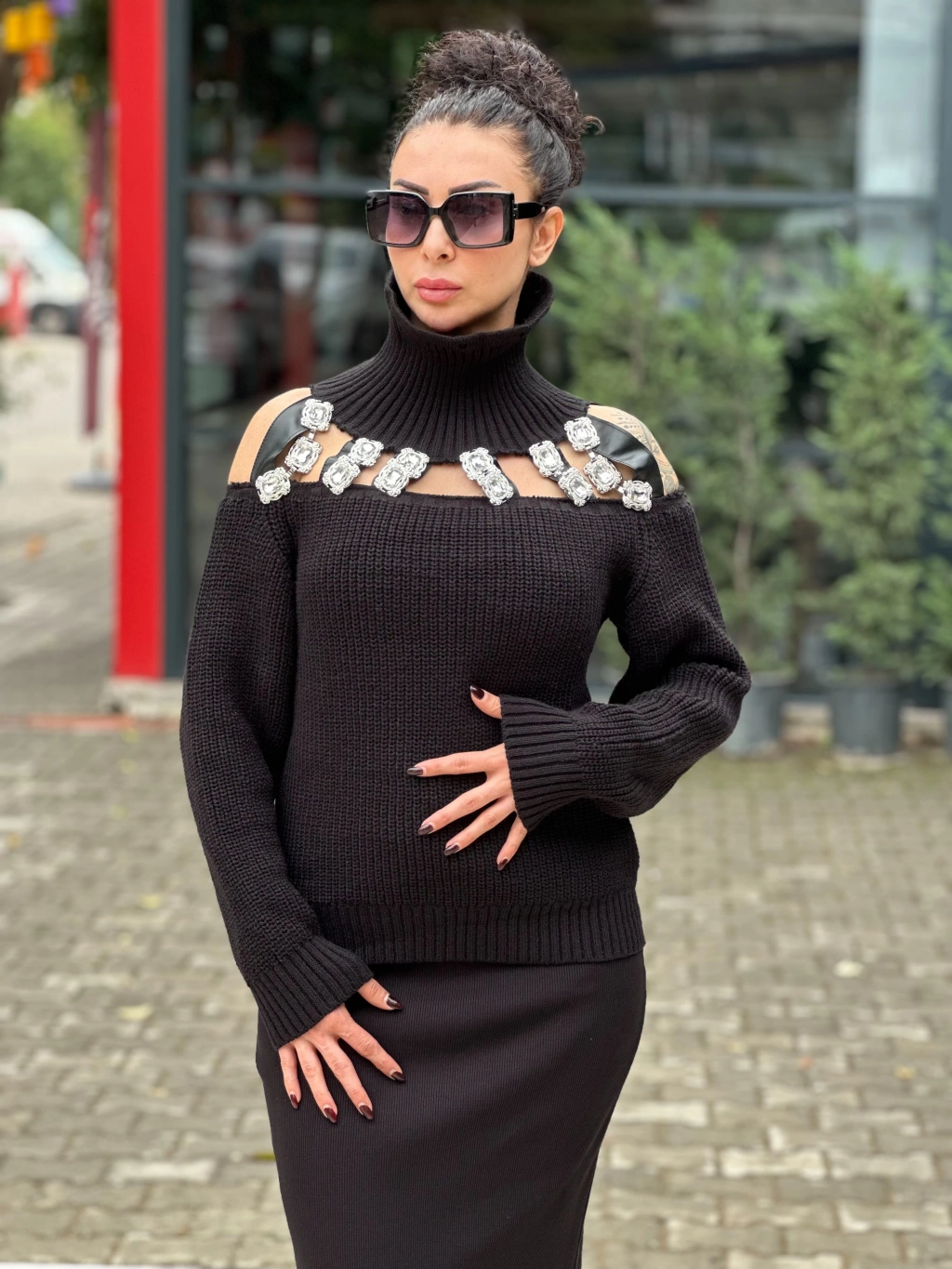 TAŞLI DERİ PENCERE DETAY SİYAH BOĞAZLI KAZAK