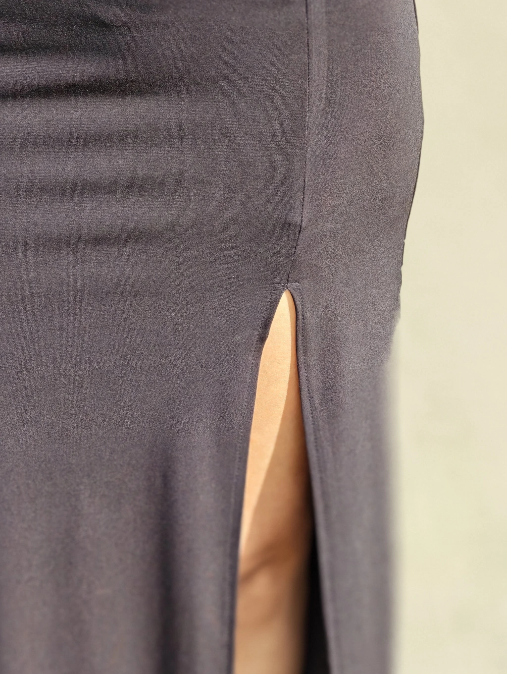 DÜŞÜK OMUZ YAN DÜĞÜMLÜ SİYAH ELBİSE
