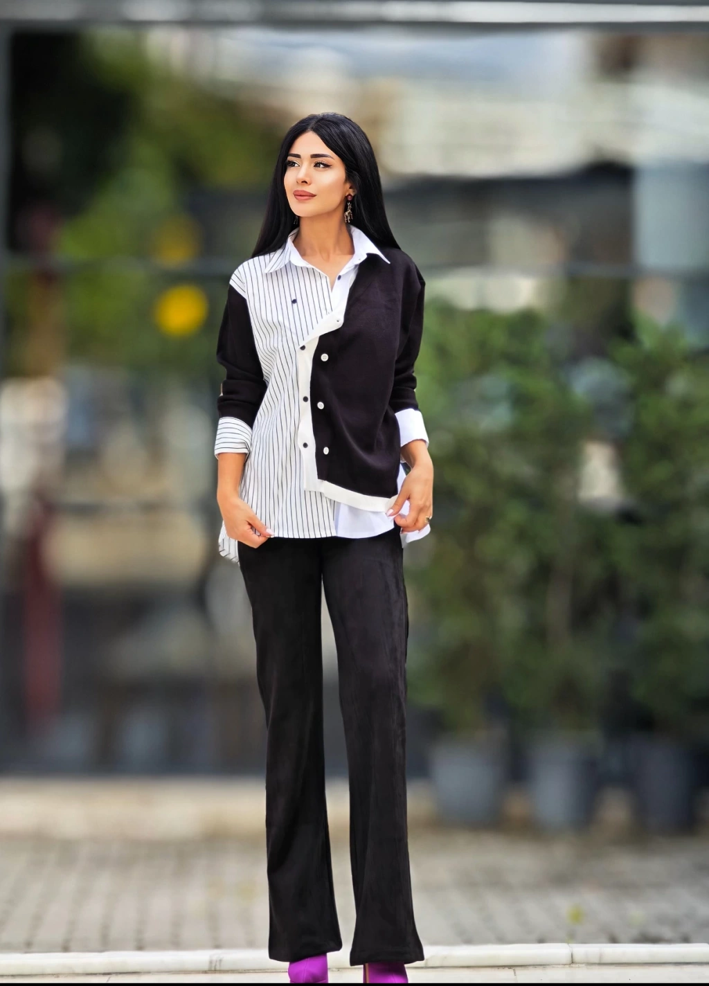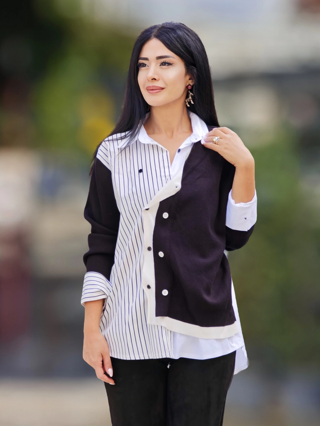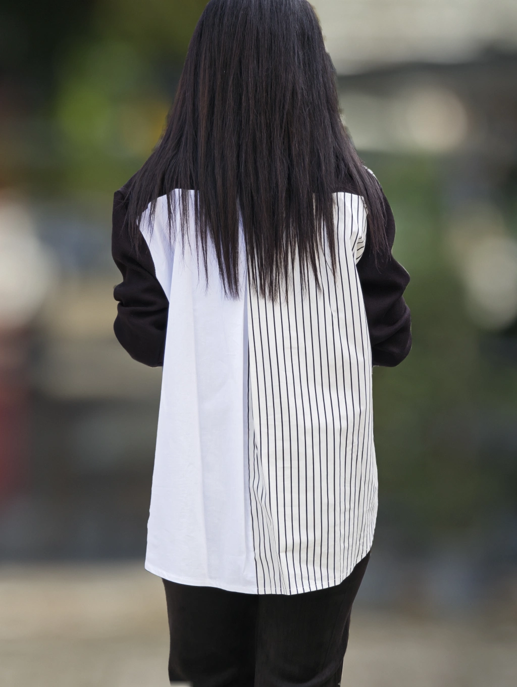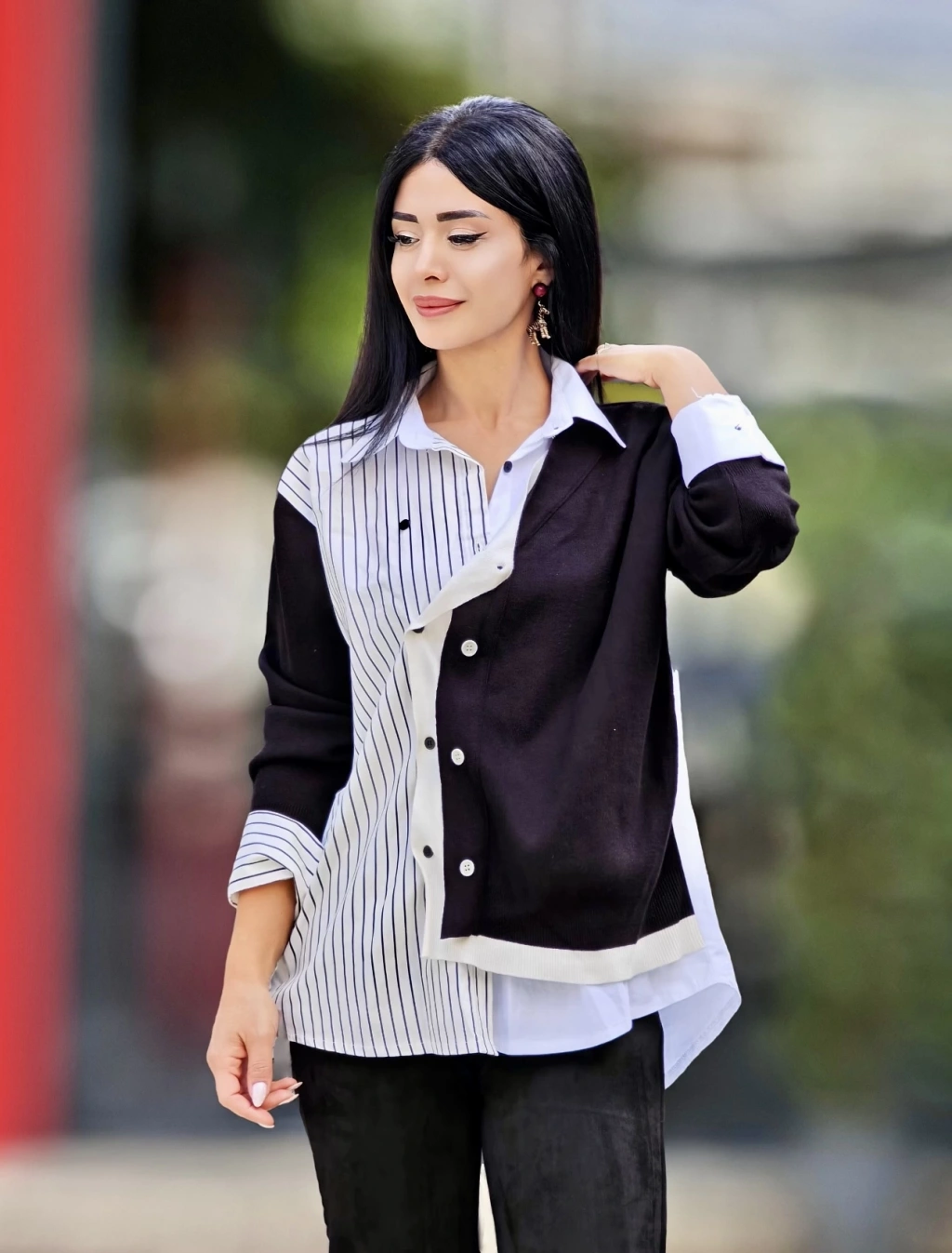 TRİKO DETAYLI SİYAH BEYAZ GÖMLEK