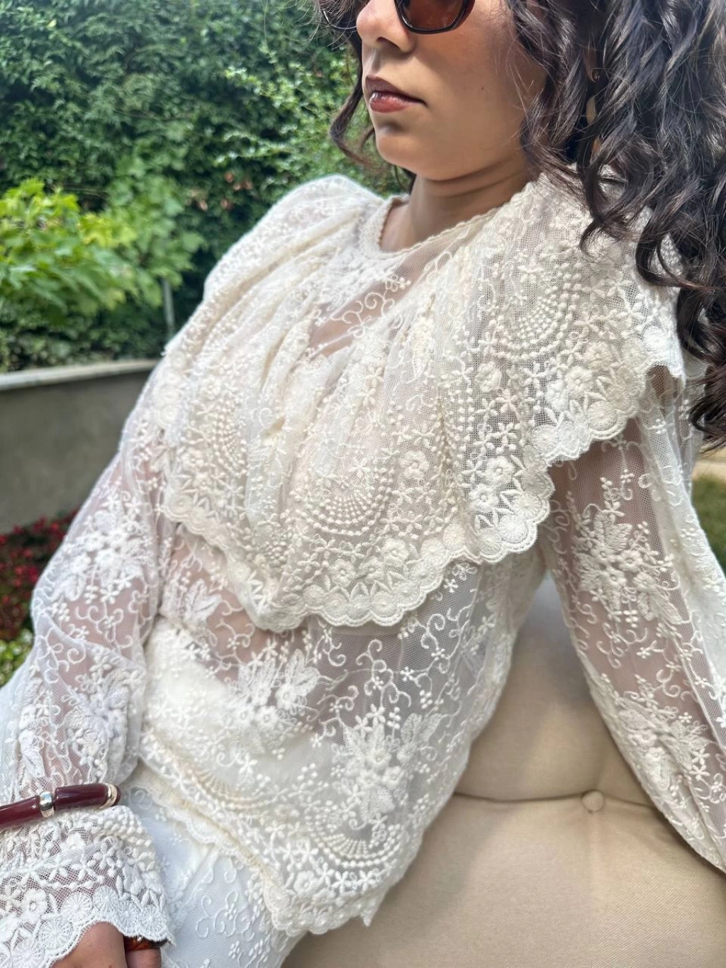 ÇİÇEK DETAYLI TRİKO BLUZ EKRU